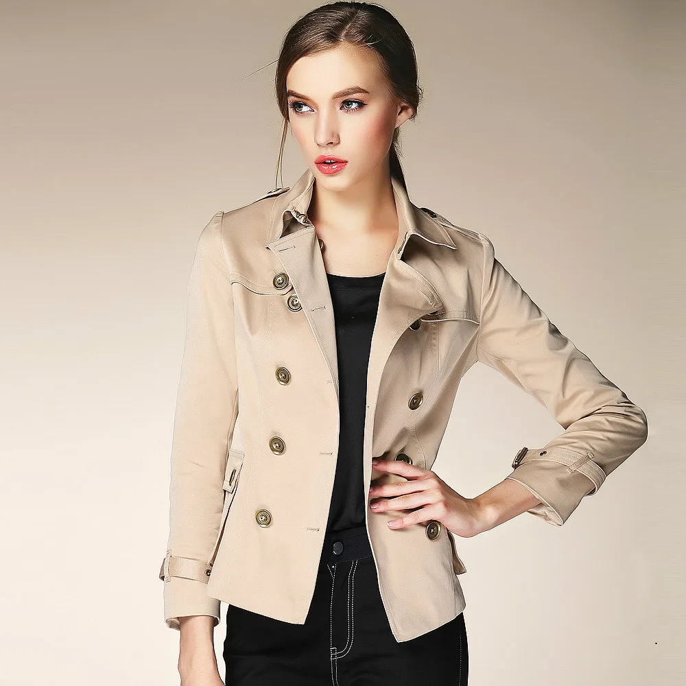 Short Ladies Trench Coat Turn down Collar Double Breasted Thin Coats